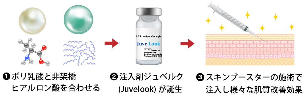 ジュベルク(Juvelook)注射とは、ポリ乳酸(PDLLA)と非架橋ヒアルロン酸製剤を合わせた注入剤であるジュベルクを注射する、スキンブースター(水光注射)のことです。ポリ乳酸はトウモロコシやジャガイモなどのデンプンから抽出したエキスによって生成されており、安全性が高い成分としてアメリカFDAや韓国KFDAにて認証を受けています。ポリ乳酸は1~2年程度かけてゆっくりと体内に吸収されることから、持続的な効果も期待できるでしょう。