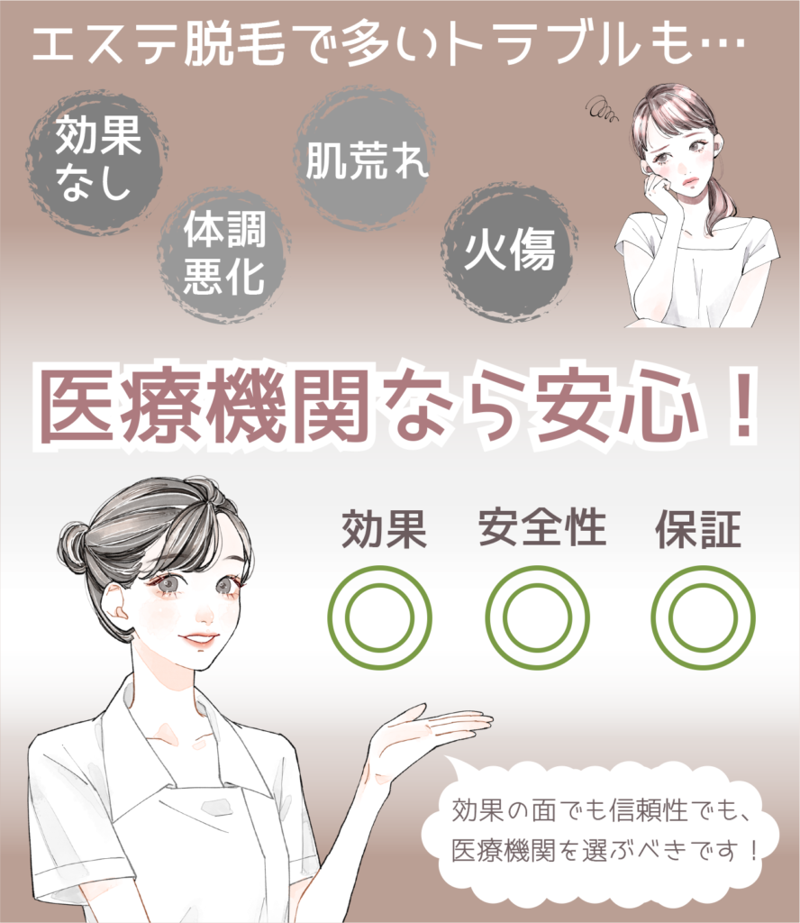 また、クリニックで医師による施術を受けられる安心感も、医療脱毛の魅力の1つです。脱毛に関して高い専門性を持つ医師に対応してもらえることから、患者様の体調に合わせた対応を期待できるでしょう。