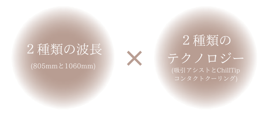 2種類の波長と2種類のテクノロジーを備えたハンドピースを組み合わせることができるため、 幅広いご要望に応じたカスタマイズ治療が可能です。