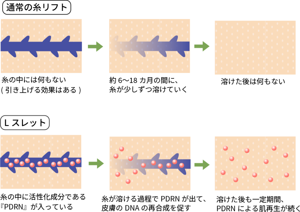 Lスレットの糸は通常の糸とは違い、活性化成分である「PDRN」が配合されています。