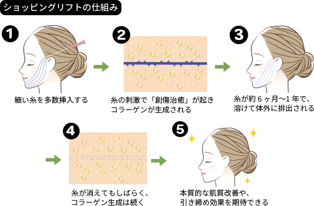 ショッピングリフトとは、特殊な「溶ける糸」を肌に挿入することでたるみを引き上げる施術方法です。施術直後でも買い物に行けるほどの気軽さから、「ショッピング」リフトと呼ばれています。また、糸が皮下で溶ける過程で真皮層を刺激し、コラーゲンの生成を促す効果も期待できます。